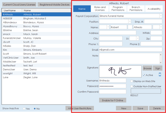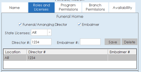 Under the roles and licenses tab, state, director and embalmer license numbers can be added to the staff member.