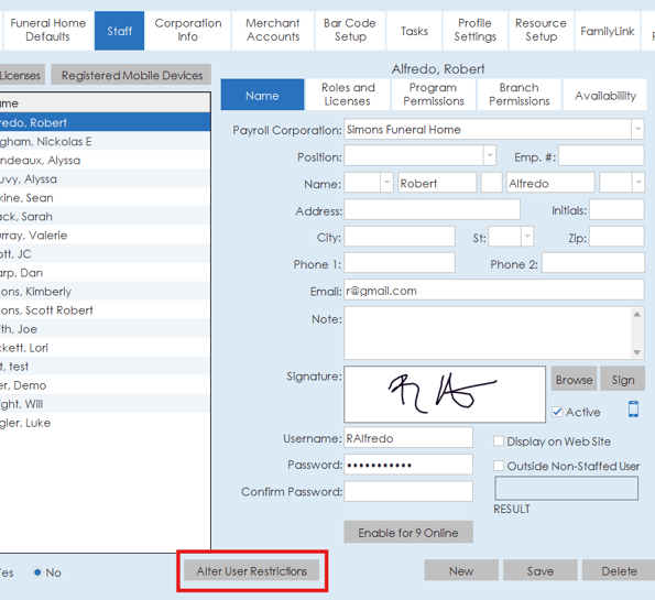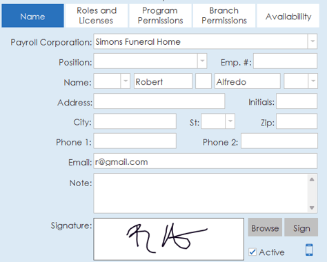 The name tab for a staff member is where you can customize information such as position, name, address and contact information. A payroll corporation can be assigned to the staff member and a signature can be uploaded to their account here that can be generated on documents. An image of a signature can be uploaded or an option to create a digital signature by signing with your mouse is available as well.