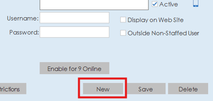 If a new staff member needs to be added to the list, click the "New" button at the bottom of the section and a blank entry will be presented for you to fill out information for the new staff member. Click the save button once you have the user information entered to save them to them list.