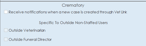 Notifications specific to crematory pet cases can be toggled here for a staff member as well if the Phoenix Pet module is enabled in your SRS software. The user can also be marked as outside veterinarian or outside funeral director.
