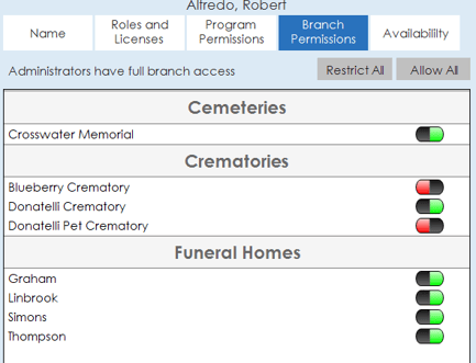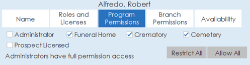 The program permissions tab is where permissions for various sections and functionality in the software can be configured for a user. Along the top of the tab, general permission levels for the program are available. An administrator has full permission access throughout the whole program. Options are available though to give access to only specific parts of the system such as funeral home, crematory, cemetery and prospect if these modules are enabled.
