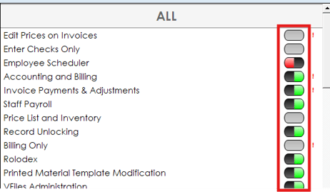 To toggle a permission, simply click the toggle box on the right side. Green indicates that the permission is on for the user, red indicates that it is off for a user and if the toggle box is grey that indicates that the permission is being negated by another permission that is currently enabled.