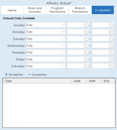 The availability section allows for a staff member to set up their daily availability schedule. For each day, the user can be set to fully available, available for specific hours or unavailable. Exceptions can be setup under the exception area if there is a particular day where the staff member may be available or not available when they usually are.