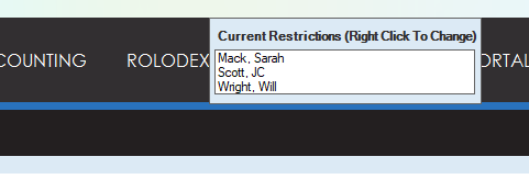 Once enabled, hovering over any page, button or field in the program will show a little restrictions window that indicates which users are restricted on that item.