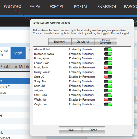 The alter user restrictions feature allows for admins to restrict specific buttons and fields in the program to certain users. Only users with administrator level permissions can use this feature. On the staff settings page, click the "Alter User Restrictions" button to enable the restriction editing mode.