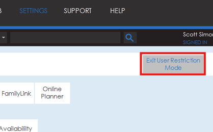 To exit the user restrictions mode once your changes are complete, simply click the "Exit User Restriction Mode" button in the upper right corner.