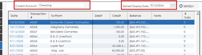 The transactions section of the accounting page will display all transactions under a certain account within the specified display date. Select an account from the current account drop down and set an earliest display date. Once you have those options set, click the refresh button to refresh the list.