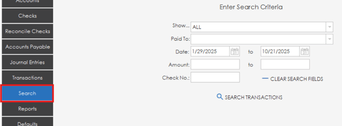 To search for specific transactions, the search tab can be used to find transactions associated to specific payees or types.