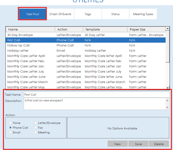 The task pool section of the utilities page is where tasks can be set up in the system. The task functionality in Prospect works a little differently then how the tasks work in other systems like Procession or Phoenix. Any tasks currently in the system will be listed out in the task list. Highlighting a task will allow you to change the task details in the section below the task list.