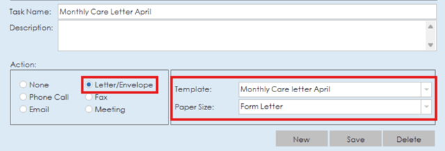 Each task has an action associated to it in Prospect. You can toggle between Phone Call, Email, Fax, Meeting, Letter/Envelope or None as task actions. If the Letter/Envelope option is set as the task action, a letter template and paper size will become an option to set on the right side. This will associate that specific letter template to the task so that the letter can be printed out and sent to complete the task.