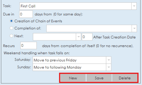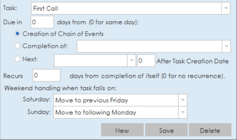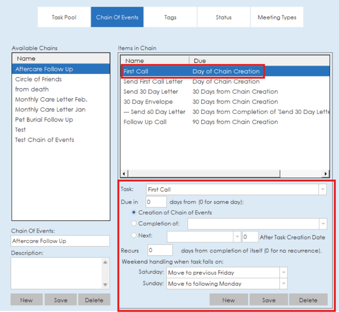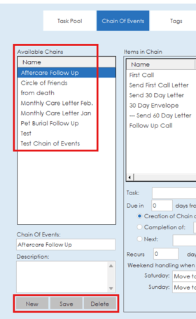 The chain of events feature in Prospect allows for tasks to be chained together in order. On the left side of the page, a list showing any chains that are currently in the system will be displayed. Chains can be edited by clicking on the chain or if you need to enter a new chain, click the "New" button at the bottom. Chains can also be deleted by clicking the "Delete" button.