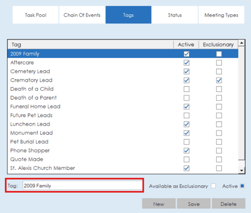 If you need to delete a tag, simply highlight the tag and click the delete button. If you need to add a new tag, simply click the new button, enter a tag name and click the save button to save it to the list.