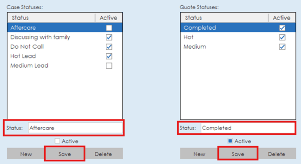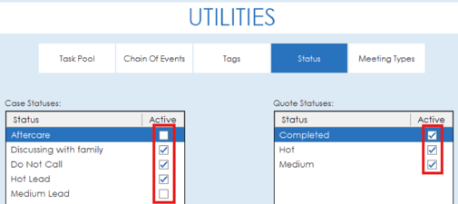 That status section of the utilities page allows you to customize the case and quote statuses that are in the system. Case statuses will be listed out on the left side of the page and quote statuses will be listed out on the right side. An "active" toggle is available beside each status to mark if the status should display as an option on cases/quotes or not.