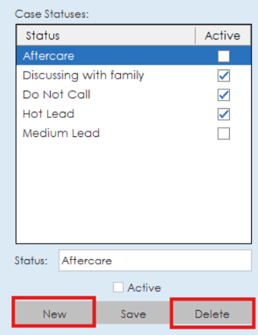 To add a new status, click the new button and enter your status name. To delete a status, simply click the status in the list and click the delete button.