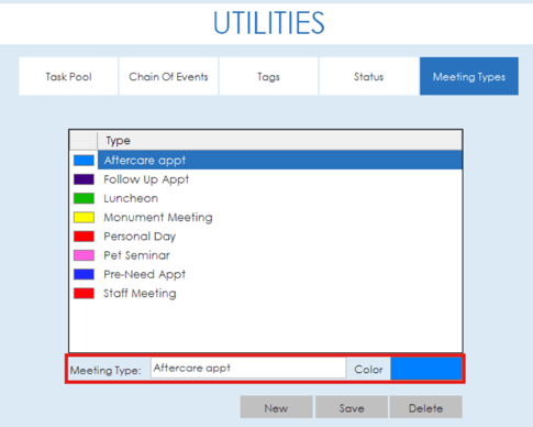 The meeting types section of the utilities page is where you can set up names for different meeting types in the system along with colors to correspond with those meeting types. To make changes to a meeting type, simply click on the meeting type in the list and you will be able to change the name of the meeting type and the color for that meeting type at the bottom of the page.