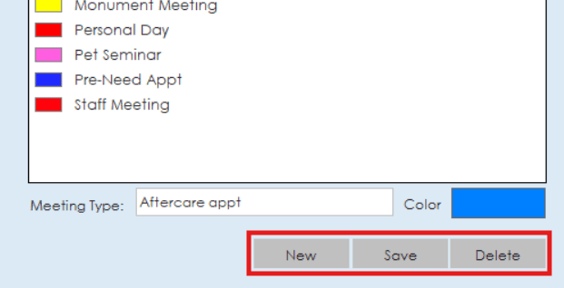 If you want to delete a meeting type from the list, simply click the meeting type and click the delete button. If you want to add a new meeting type, click the new button, enter the name and color for the meeting type and save the meeting type with the save button.