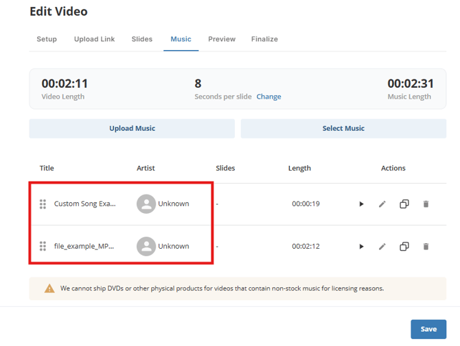 Click the "Select Music" option and change the music to one of the stock songs from the music library.