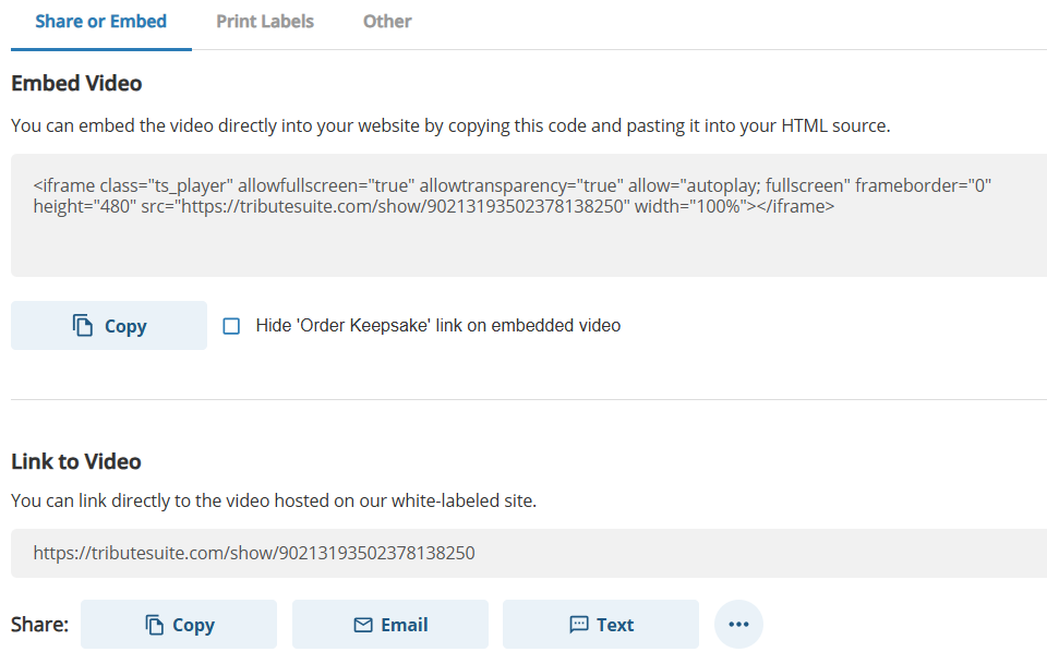 Below the downloadable files section, there will be some options available for sharing the video and printing labels. For sharing videos, an iFrame embed code will be available to embed the video on a website page or a direct link to the video will also be available. There are options below the video link to email or text the video link.