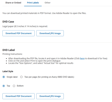 The print labels tab gives you options for downloading the DVD case cover and the DVD label. Both of these options can be downloaded in either PDF or JPG format. There are also options available to customize the label style.