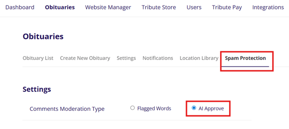 To turn on AI moderation, navigate to the Spam Protection tab under the Obituaries section of your website admin dashboard. On this page, you will see two options available for comment moderation.