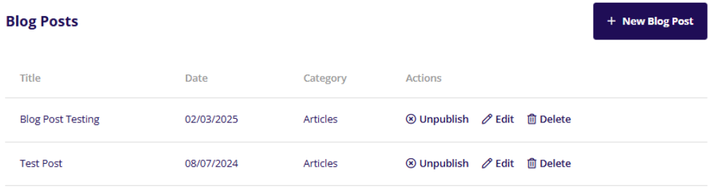 This section is where you will see your blog articles listed. Title, Date and Category will be displayed along with some actions available to publish/unpublish, edit or delete the article. To add a new article click the New Blog post button.