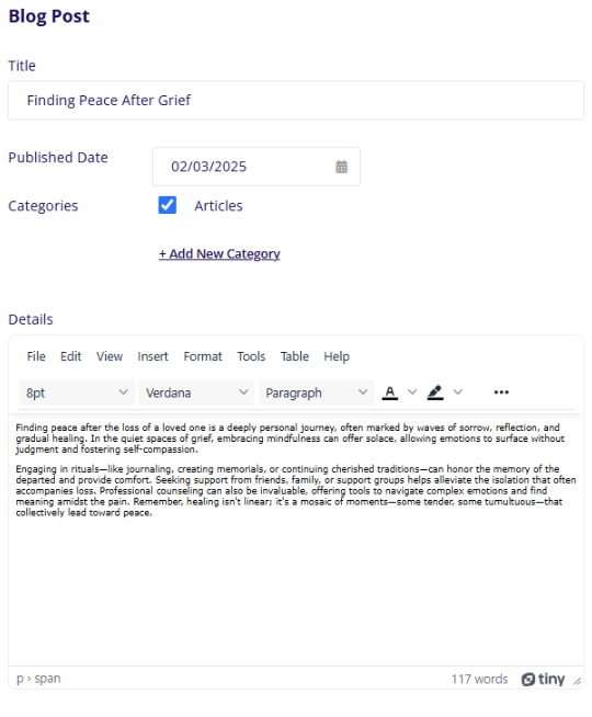 The Blog Post page is where you can edit the content and details of a blog post. Title, Date, Photo and Category along with a preview of the details will display in the article preview on the blog page. Once the article is opened the full write up in the details section will display containing all the content for the article.