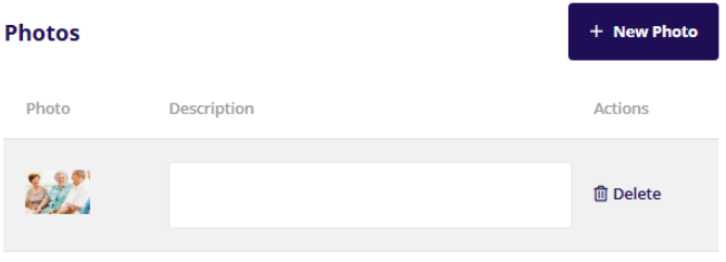 The Photos section is where you can add your cover image for the blog article. To add a new photo click the New Photo button. A description can be added to the image as well.