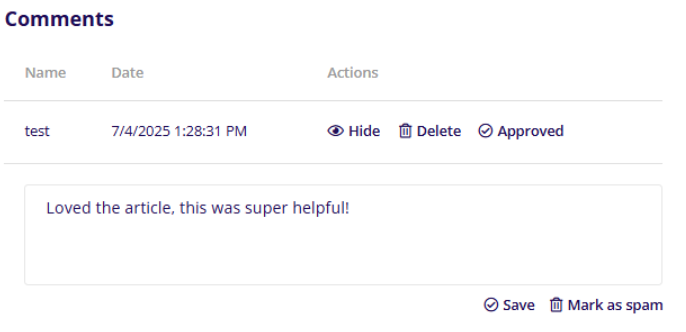 This section will show any comments left on this particular article. Name and Date of the comment will be shown. Clicking the Show button will open up the comment message and give you the option to edit the message or mark the message as spam. Comments can also be approved or deleted from here as well.