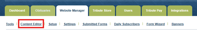 The content editor is an older website editor that allows you to make changes to the content and overall design on your website pages. Any website with no website builder enabled should see a content editor tab under the Website Manager section.