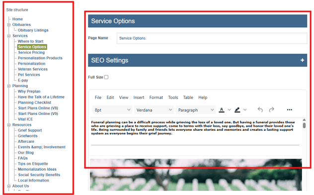 In the content editor section, pages will be listed out on the left side and the content within the selected page will display on the right side.