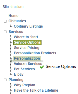 Pages can be dragged and dropped in the site structure list to organize where they will appear in the navigation menu of the website.