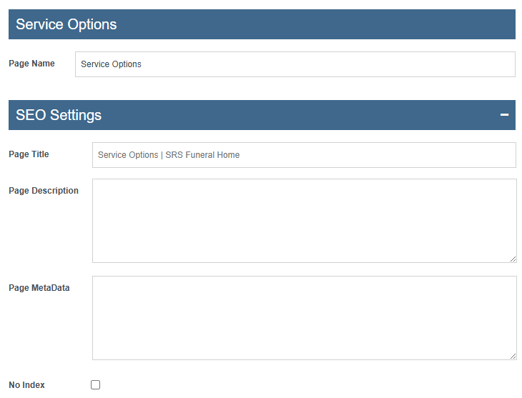 Each page will have a page name section where you can title the page as you would like it to appear on your website. SEO settings are also available to make changes to the title, description and meta data of the page. These SEO options will customize how your page will display in search engine results.