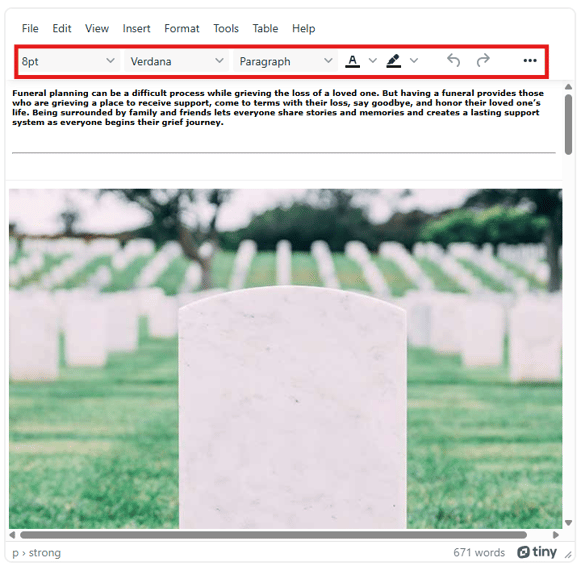 The content that appears on the page will display within the editing box. This box uses a text editor style functionality. To make changes to the content, you can edit text like in any text editor and utilize the text styling options at the top to style the text content on the page.