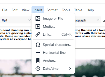 Under the insert tab at the top of the editor, various options are available to add images, videos, files and links.