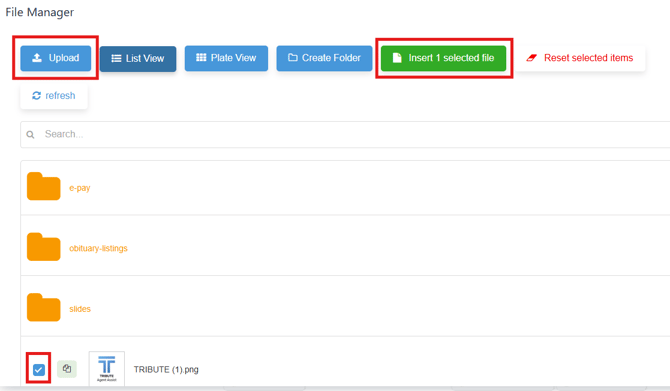 Clicking the "Image or File" option will open the file manager where you can upload files to insert to the page. To upload a new image or file, click the upload button at the top of the window. To insert an image or file, check the box beside the file and click the insert selected file button at the top.
