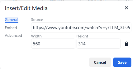 Videos can be embedded on the page via the "Media" option in the insert menu. Clicking the media option will open the media window where you can add a source URL to a video and customize the width and height of the embedded video on the page.