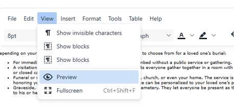 To view how the page content will look on the live website, a preview option is available under the view tab.