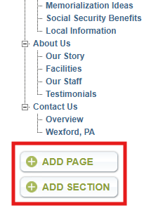 New pages can be added via the "Add Pages" button and new sections can be added via the "Add Sections" button. Sections act as categories of pages, in the navigation menu of the website, sections will be displayed with pages listed underneath them.