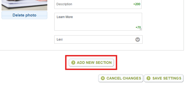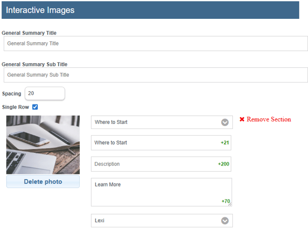 Images can be changed by deleting the photo and adding a new photo. Links, labels and descriptions that appear over the image can be customized in the various boxes. Sections can also be completely removed using the "remove section" button. New sections of interactive images can be added via the "Add New Section" button at the bottom.