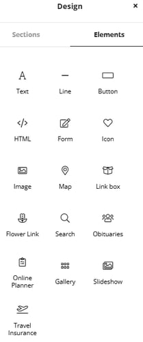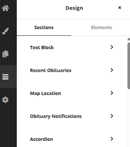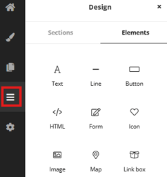 The design section of the builder is where all the design elements are available to be added to pages.