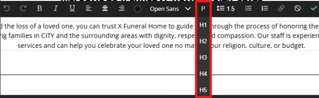 The font tag will determine what category of text will be displaying in the text box. H1 - H6 tags represent different sizes of title text and the P tag represents standard paragraph text.