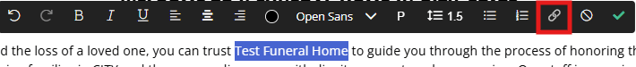 To add links to text in the text box, highlight the text you want to link and click the paperclip link icon in the tool bar.