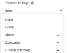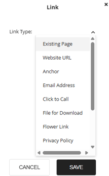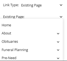 The existing page link type allows you to link a page that is hosted on your website. Once you select this option you will be shown a dropdown of pages that are on your website to select from.