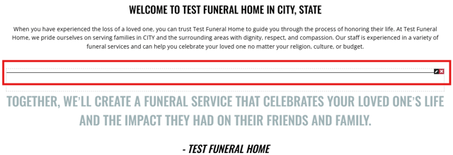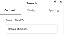 The search element adds a search bar to the page that allows the user to search for an obituary on the website. Typing the name will populate options that match in a dropdown style. Once the name is clicked the user will be taken to that obituary page.