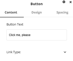 In the editing settings, the button text can be changed to whatever you would like it to say and any link type can be added to the button. There are also design options available in the design tab for changing style, color and spacing of both the button and the text inside the button.