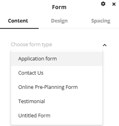 Once the form settings window opens you will have a dropdown list available with all the forms that are currently in the form wizard on the admin dashboard along with design and spacing options to customize the size, colors and styling of the form components. Select a form from the list to add it to the page.