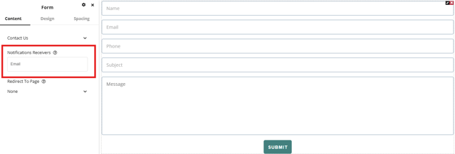 Once the form is added to the page you will see the form embedded displaying it’s various fields and buttons. An option should now be available in the content settings window to add email addresses to receive notifications of form submissions for this form. Any email addresses added here will receive an email any time this form is submitted by a user to notify that a submission has occurred. Form submissions can then be reviewed from the admin dashboard. If adding multiple emails to this section, use a comma to separate each email.