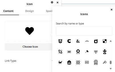 There are hundreds of icon’s available in the library for you to choose from, they can be search for via name or type in the search bar. One and icon is selected, the link type dropdown will let you set a link on the icon for the user to click. Options are also available under the design and spacing tabs to customize the color, size, border and spacing of the icon.