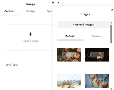 The settings window gives an upload image option for you to add an image, click here to open the image selection. The default tab will show stock images that are in the system already. The custom tab will show any previously uploaded images that you have added to the website. If you want to upload a new custom image, click the upload Images option at the top. Any newly uploaded image will appear at the top of the list in the custom tab, click on an image to add it to the page.