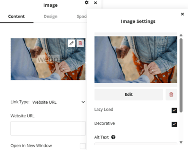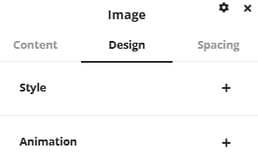 Other options are available under the design and spacing tabs that allow for customizing the sizing, spacing, border and animation of the image element.